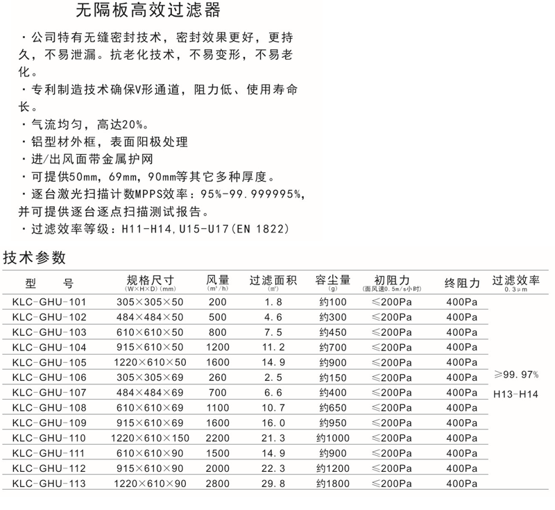 無隔板高效過濾器